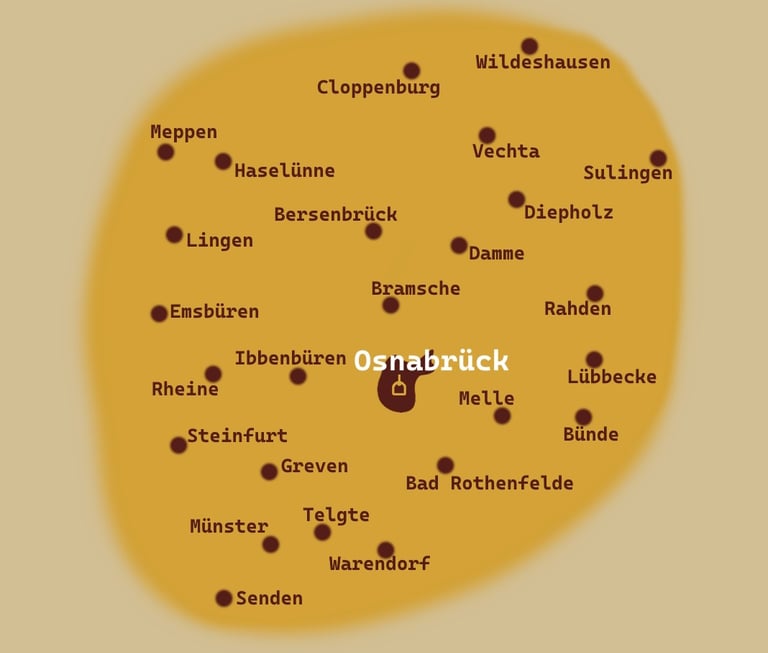 Im Umkreis von ca. 100 km rund um Osnabrück komme ich ganz bequem zu Ihnen in den Stall. Die ungefähre Region können Sie auf dieser Karte sehen:
